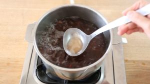 - 鍋を中火にかけ、沸いたらアクをすくい取ります。煮ている最中、小豆が湯から出ないように時々さし水をします。