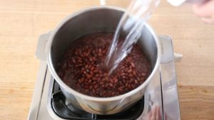 - 渋切りをした小豆と水を入れて煮ます。ここでの水の量は豆の4~5倍ほどです。