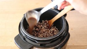 - 全体が混ざったら小豆の茹で汁を少しずつ加えます。