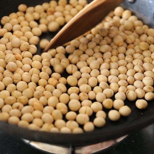 - 大豆をフライパンに入れ、木べらで混ぜながら強火で20分ほど炒ります。