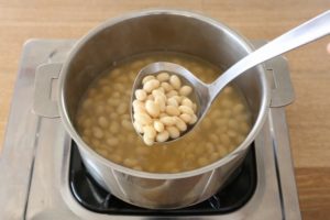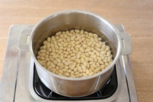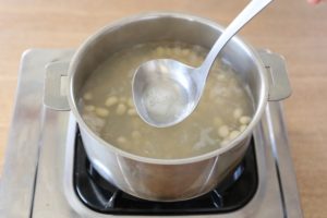 - 戻した豆を水と一緒に鍋に入れ、弱火にかけます。
