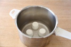 - 圧力鍋に2cmほど水を入れ、蒸し皿を置きます。