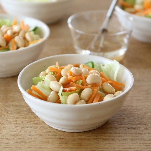 - レタスを適当なおおきさにちぎり、きゅうり、にんじん、大豆とお皿に盛り付けます。