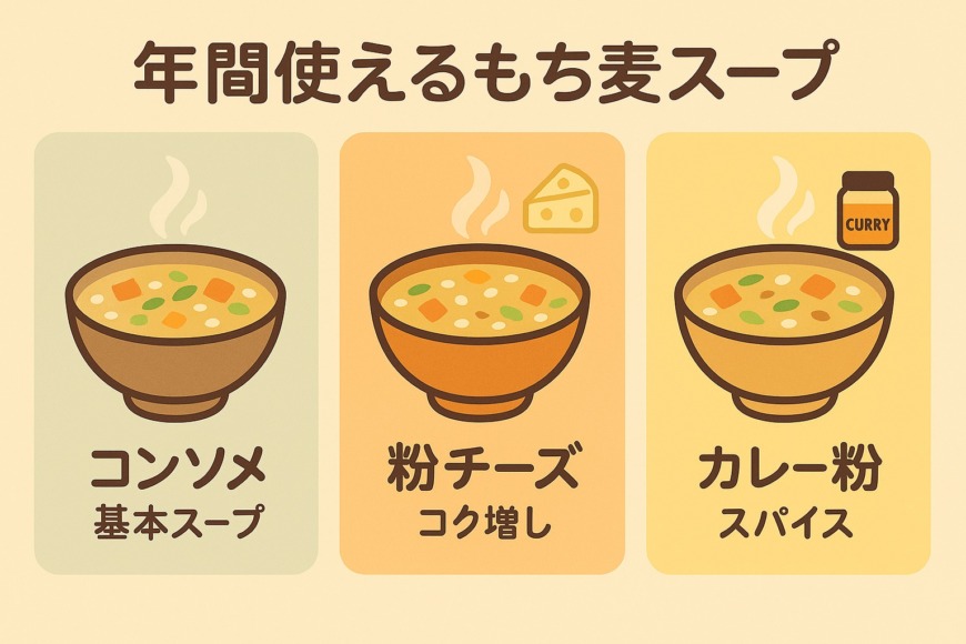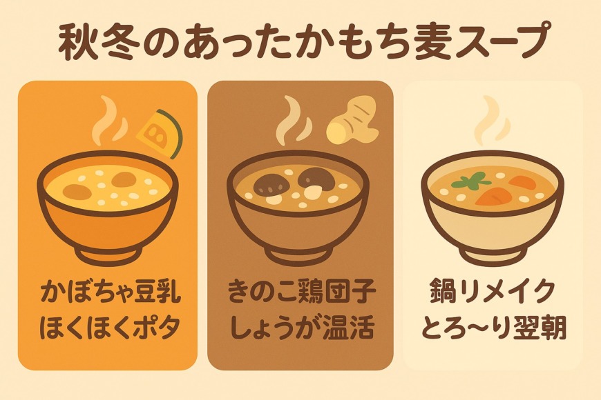 もち麦スープは、季節ごとの旬の食材を使うと、コストを抑えつつ栄養も味わいもぐっと高まります。スープの温度やとろみを季節や体調に合わせて変えるだけでも、毎日の食事に取り入れやすくなるでしょう。