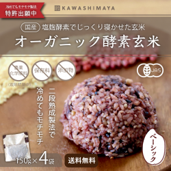 かわしま屋オーガニック酵素玄米は、塩こうじ酵素でじっくり寝かせた、ビタミンとミネラル・アミノ酸たっぷりの酵素玄米ごはんです。独自の二段熟成製法によってさらに美味しくなりました。ベーシック×1袋、もち麦タイプ×1袋、雑穀タイプ×1袋、4色大豆×1袋、合計4袋入りです。