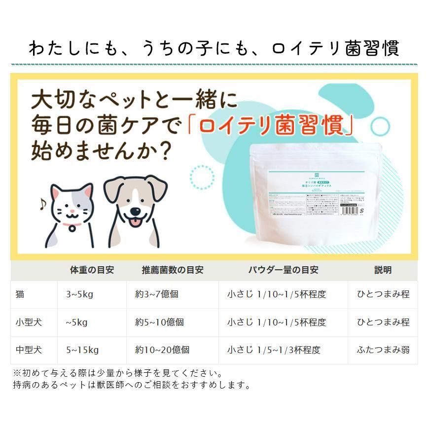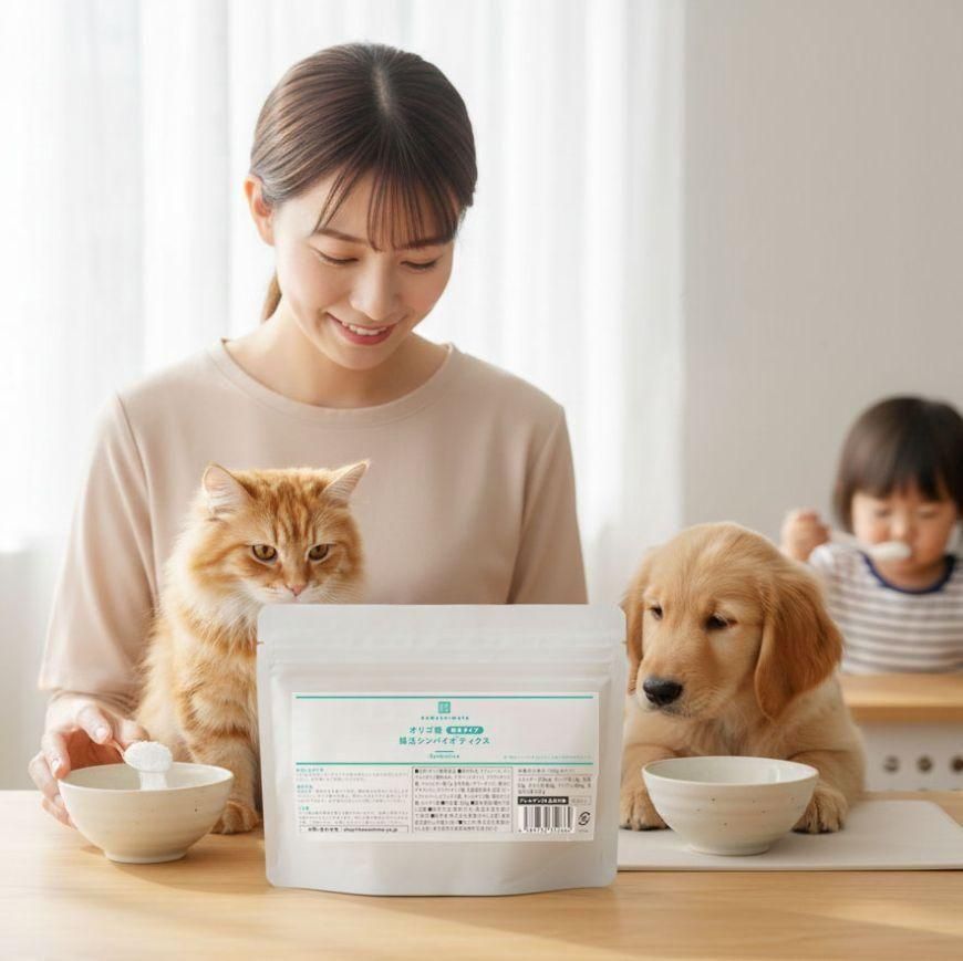 小型犬や猫には「粉末ふりかけを軽くひとつまみ」、中型犬なら「2つまみ」程度で手軽に腸内ケア。