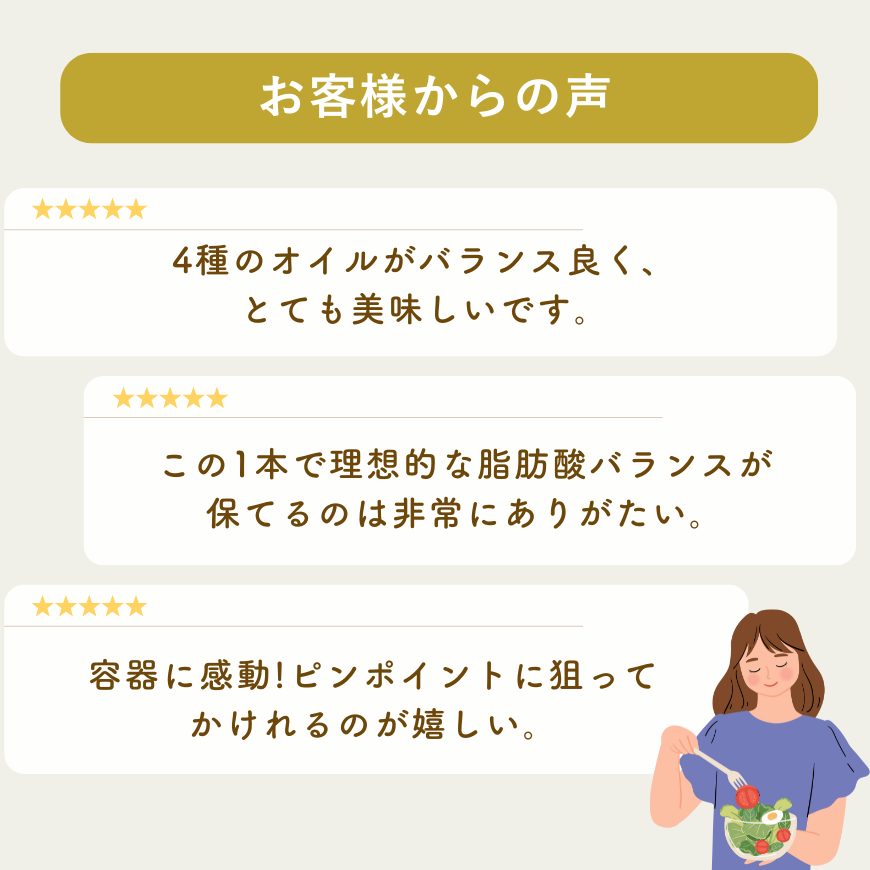 ¹ñÆâ¤Ç͵¡Ç§¾Ú¤ò¼èÆÀ¤·¤Æ¤¤¤ë¿©ÍÑ¥ª¥¤¥ë¤Ï¤Þ¤À¸Â¤é¤ì¤Æ¤¤¤Þ¤¹¤¬¡¢¤½¤ÎÃæ¤Ç¤â¡Ö͵¡¥Ð¥é¥ó¥¹¥ª¥¤¥ë¡×¤Ï¡¢¾Æ¤²Û»Ò¤ÎÁ¡ºÙ¤ÊÉ÷Ì£¤ò»¤Ê¤ï¤Ê¤¤Àä̯¤Ê¥Ö¥ì¥ó¥É¤¬Ì¥ÎϤǤ·¤¿¡£ ÆÃ¤Ë¥ª¥¤¥ë¤ÏÁǺà¤Î¹á¤ê¤äÌ£¤ï¤¤¤¬¥À¥¤¥ì¥¯¥È¤ËÅÁ¤ï¤ë¤¿¤á¡¢¹ç¤ï¤»¤ëÎÁÍý¤ä¾Æ¤²Û»Ò¤Î¼ïÎà¤Ë¤è¤Ã¤Æ¤Ï¼çÄ¥¤¬¶¯¤¯½Ð¤¹¤®¤Æ¤·¤Þ¤¦¤³¤È¤â¤¢¤ê¤Þ¤¹¡£ ¤Ç¤¹¤¬¡¢¤³¤Î¥ª¥¤¥ë¤Ï¥¯¥Ã¥¡¼¤ÎÍ¥¤·¤¤´Å¤µ¤ä¹á¤Ð¤·¤µ¤ò¤½¤Ã¤È°ú¤Î©¤Æ¡¢ÁǺà¤Î»ý¤ÁÌ£¤ò²õ¤µ¤Ê¤¤¡Ö̾¼Â¤È¤â¤Ë¥Ð¥é¥ó¥¹¤Î¼è¤ì¤¿¥ª¥¤¥ë¡×¤À¤È´¶¤¸¤Æ¤¤¤Þ¤¹¡£ ¥¯¥Ã¥¡¼ºî¤ê¤Ë¤ª¤¤¤Æ¡¢É÷Ì£¡¦¿©´¶¡¦ÁǺà¤ÎĴϤò½Å»ë¤¹¤ë»ä¤¿¤Á¤Ë¤È¤Ã¤Æ¿®Íꤷ¤Æ»È¤¨¤ëµ©Í¤Ê¸ºß¤Ç¤¹¡£