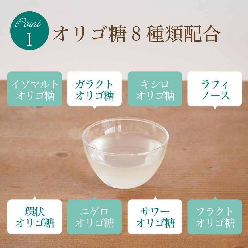 8種類のオリゴ糖に加え、乳酸菌・ビフィズス菌・食物繊維を配合しました。サプリメントではなく、食品として毎日の食事で自然に取り入れられます。