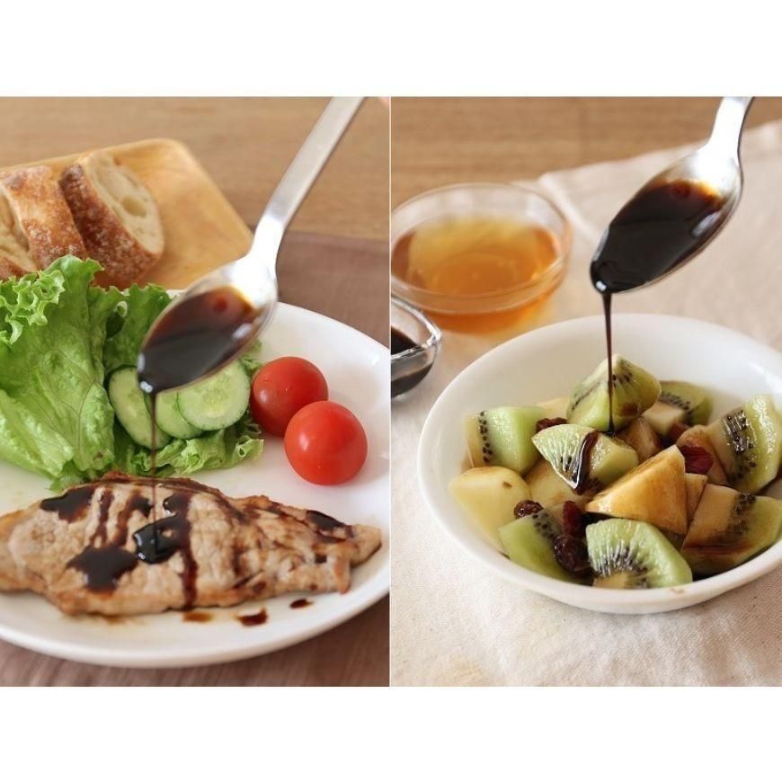 一般的なバルサミコ酢では、イタリア風サラダにかけたり、お肉のメイン料理やデザートのソースなどのイメージがありますが、バルサミコ酢の奥行きのある味わいは和食にもピッタリです。お豆腐や納豆にかけてアクセントにしたり、煮物や下味に加えてもフルーティーなコクや深みが出ます。