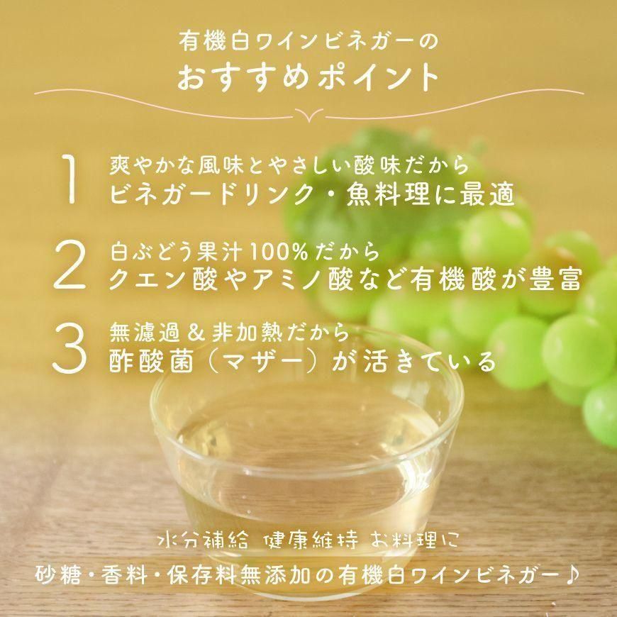 イタリア産糖類・香料・添加物不使用の有機・無濾過白ワインビネガー。豊富な酢酸菌に加えて、クエン酸、アミノ酸、オレイン酸などの有機酸が豊富に含まれています。5~10倍に希釈してお召し上がりください。