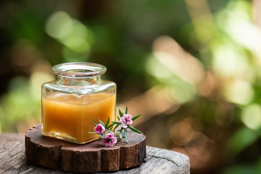 高純度生マヌカハニー。巣箱の中で完熟したはちみつを年に一回最良の時期に収穫しています。