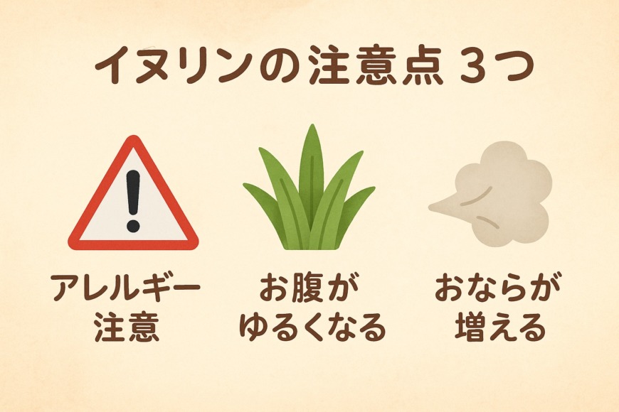 イヌリンは健康に良いとされる成分ですが、使い方によっては副作用やデメリットもあります。ここでは代表的な3つの注意点を整理します。