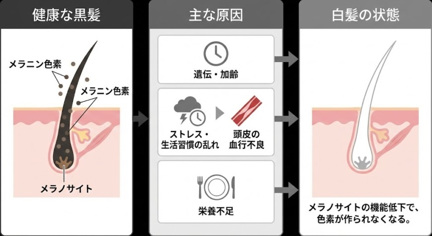 髪は毛根の「メラノサイト」が作る「メラニン色素」によって黒くなります。白髪は、メラノサイトの機能が低下し、メラニン色素が作られなくなったり、髪に供給されなくなったりした状態です。