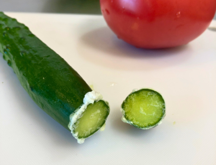キュウリはヘタを切り落として、切り口をすり合わせると、画像のように白いモコモコが出てきます。これがキュウリの苦味の原因であるギ酸ですね。ギ酸を洗い流して、斜め薄切りにしていきます。トマトも串切りにしちゃいます。