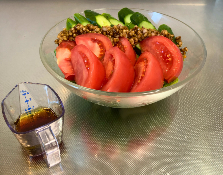 ドレッシングははちみつと、しょうゆ、オリーブオイルにリンゴ酢を混ぜて作りました。サラダに作り置きしておいたもち麦を合わせたら完成です。