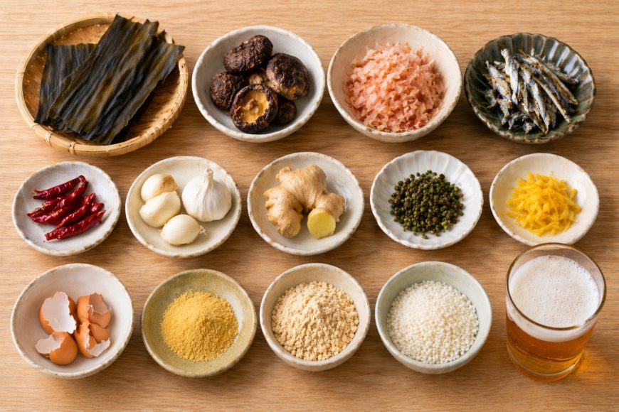 ぬか床の酸味を和らげたいときや、発酵の勢いを整えたいときに試しやすい食材です。はじめて試すなら、昆布・干し椎茸・唐辛子あたりから入ると失敗しにくく、ぬか床の変化も感じやすいです。